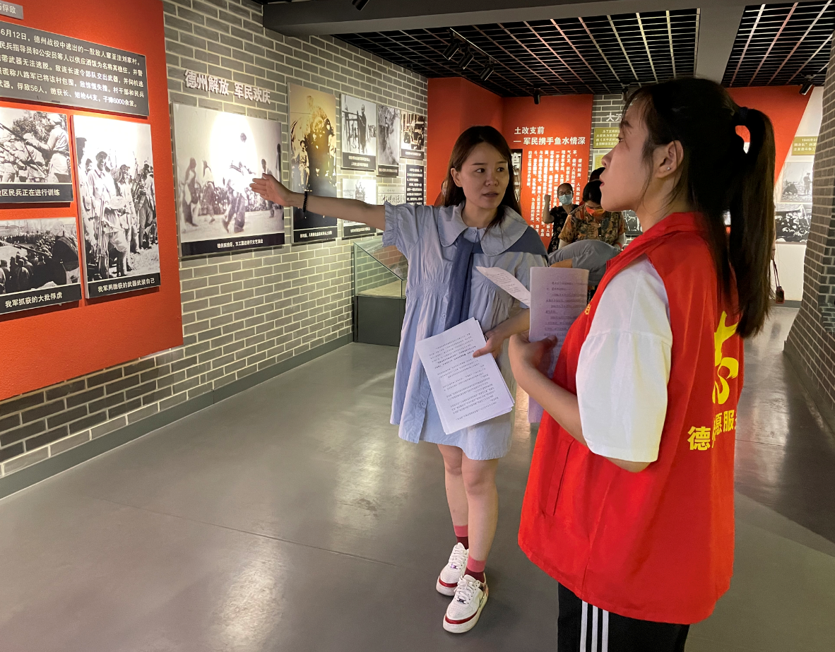 图为实践队队员在纪念馆进行红色文化讲解练习,深入学习红色文化故事,传承红色基因。中国青年网通讯员 钱兆勇 供图